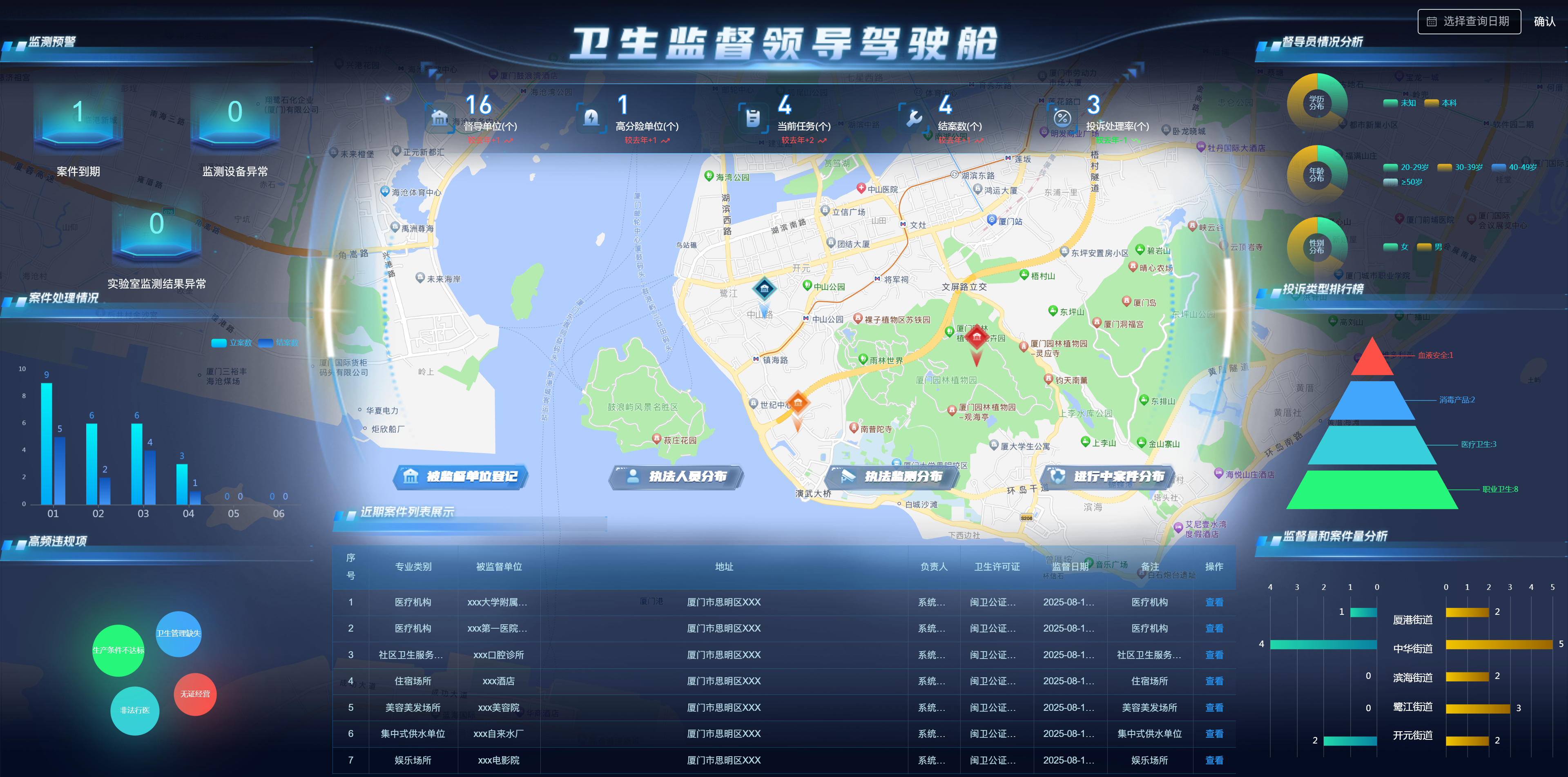 “智慧衛(wèi)監(jiān)綜合監(jiān)管服務管理系統(tǒng)”涵蓋監(jiān)督執(zhí)法應用、非現(xiàn)場執(zhí)法應用、碼上監(jiān)管、可視化駕駛艙、信息交換系統(tǒng)等內(nèi)容,實現(xiàn)加強衛(wèi)生監(jiān)督綜合執(zhí)法能力建設,依法推進衛(wèi)生監(jiān)督工作,不斷創(chuàng)新衛(wèi)生監(jiān)督執(zhí)法手段,提高衛(wèi)生監(jiān)督的監(jiān)管和應急處置水平,通過建設智慧衛(wèi)監(jiān)系統(tǒng),將傳統(tǒng)現(xiàn)場監(jiān)管與非現(xiàn)場物聯(lián)網(wǎng)智能監(jiān)督監(jiān)測手段相結合,解決目前衛(wèi)生監(jiān)督機構無法及時掌握和處置突發(fā)狀況的問題,做到在第一時間獲取現(xiàn)場數(shù)據(jù),在事件發(fā)生、升級前提前預警和處置,提高執(zhí)法效率。